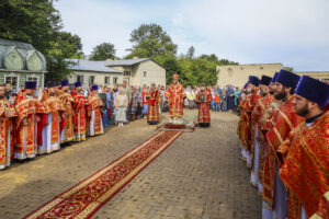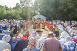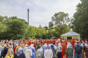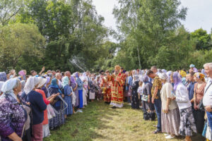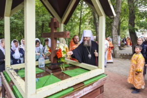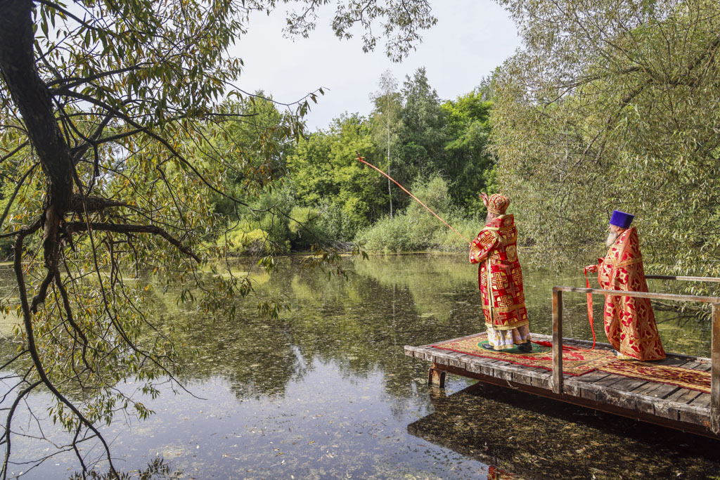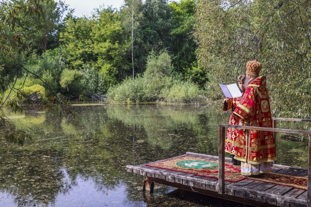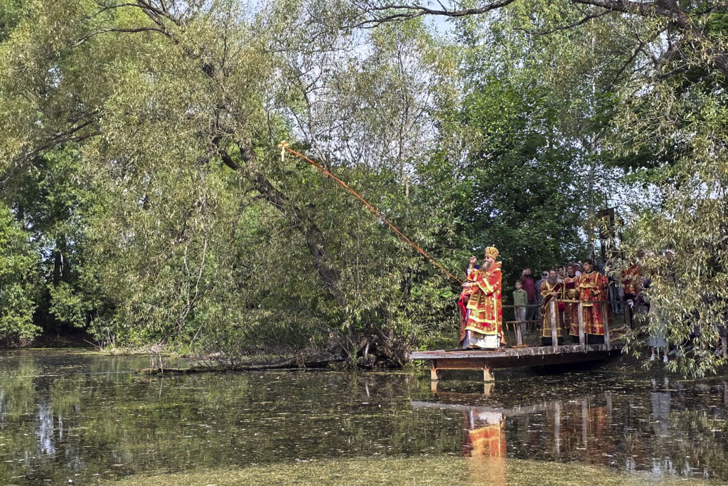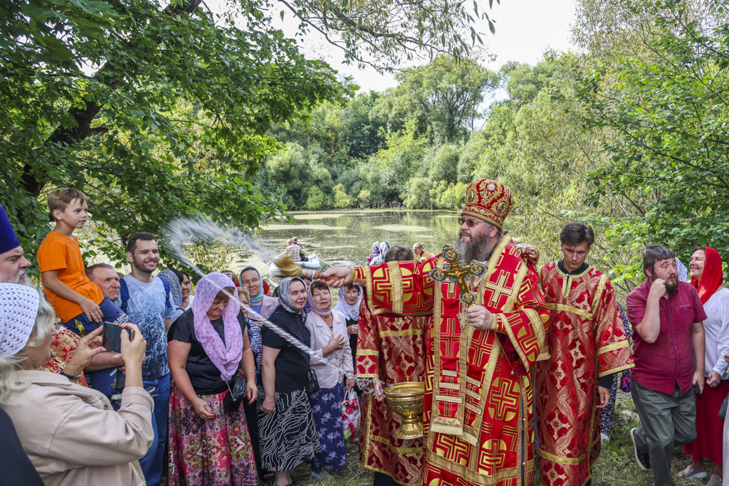 По окончании Литургии был совершен праздничный молебен с крестным ходом на монастырское озеро, где митрополит Феодосий освятил воду.