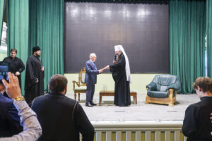 В завершение лекции А.И. Осипов ответил на поступившие вопросы, после чего митрополит Феодосий поблагодарил высокого гостя и вручил сертификат об участии во II Всероссийских чтениях «Духовное и научное наследие архиепископа Луки (Войно-Ясенецкого) и современность».